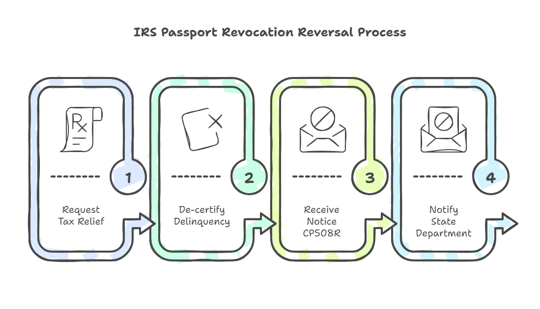 The IRS will mail you Notice CP508R advising the reversal of the passport revocation. The IRS will send the notification to the State Department, giving you clearance to use or apply for a US passport.